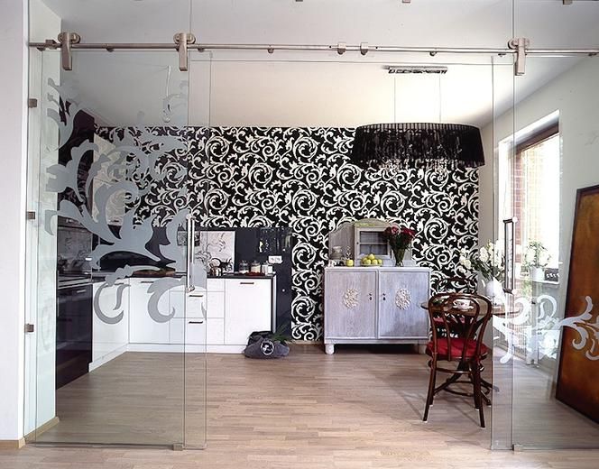 Кухнята беше отделена от останалата част от апартамента от стъклена стена с плъзгащи се врати. Това е добро решение за хора, които не знаят дали да затворят или отворят кухнята . Закаленото стъкло е прикрепено към стената със стоманени елементи. Това са и дръжките за плъзгане на вратата. Пясъчната рисунка върху стъклената врата повтаря мотива на тапета.