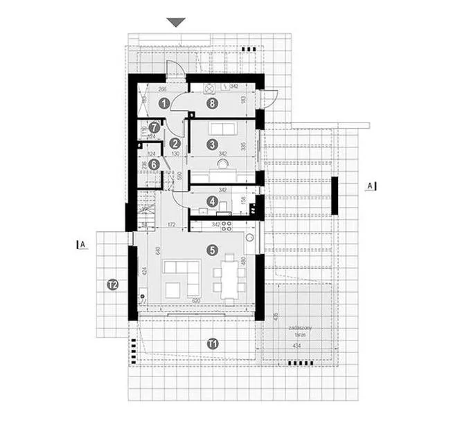 Фронталната част на фронтонната стена е почти аскетична - входна врата и тесен вертикален прозорец. Фасадата от другата страна на къщата е изцяло остъклена стена. Благодарение на това жителите ще имат страхотна гледка към околността.Откъм градината тялото на къщата е заобиколено от просторна тераса, също завършена с бял бордюр. Той е частично покрит, което ви позволява да прекарвате времето си на открито, без да се страхувате от времето.